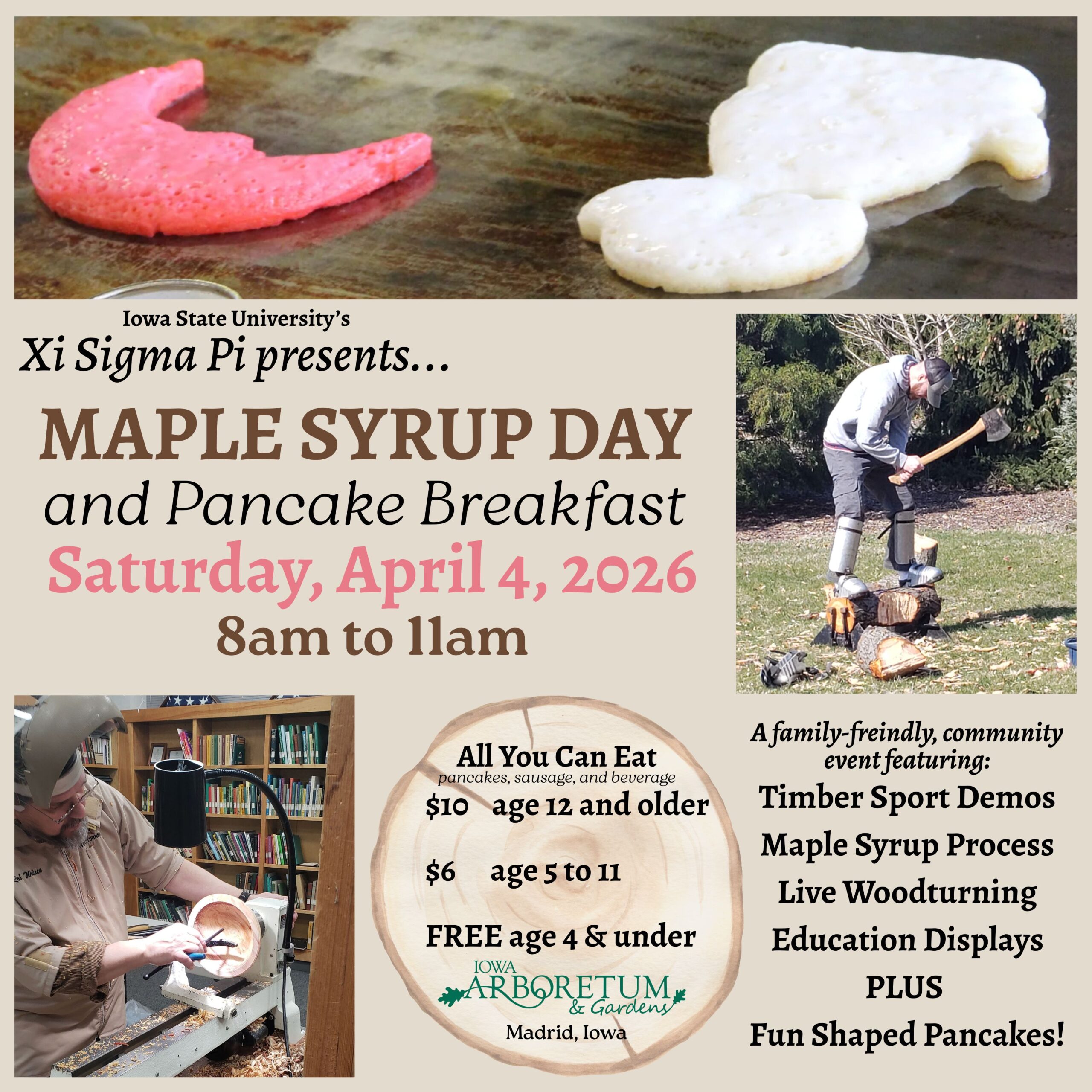 Come for all you can eat pancakes and learn about the maple syrup process! Other demonstrations include timber sports, wood turning craft, and educational displays. Students running the day are from the ISU Xi Sigma Pi Forestry program. Saturday, April 4, 2026 from 8am-11am