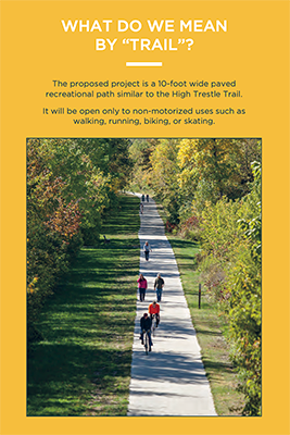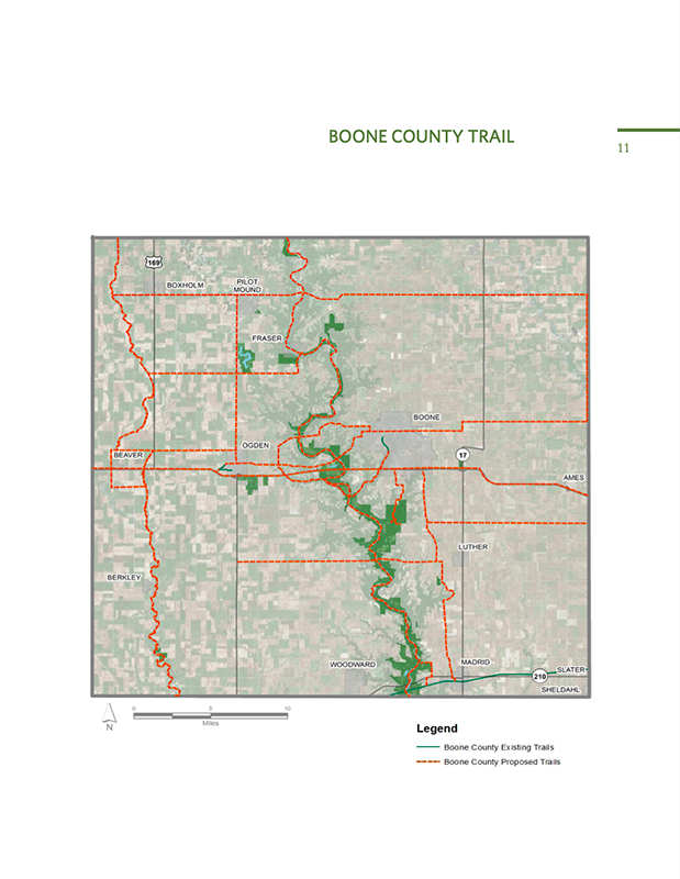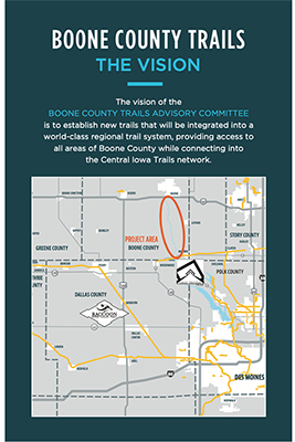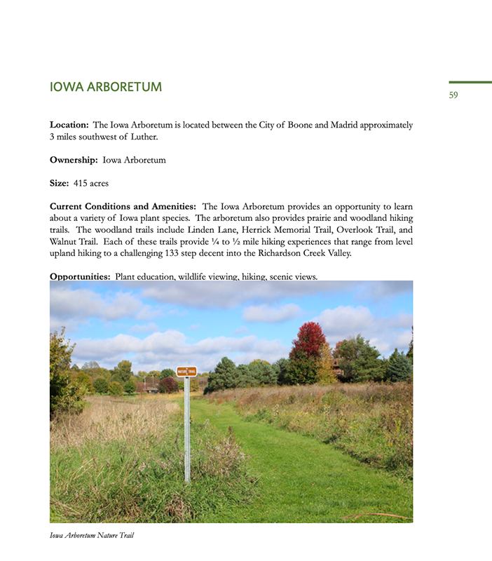 Initiative: The Iowa Arboretum is working with the Boone County Trails Advisory Committee to bring a bike trail to the “front door” of the Iowa Arboretum. The north/south trail will come from the city of Boone and from the High Trestle Trail in Madrid and connect with Grant Woods, Swede Point Park, the Iowa Arboretum, Ledges State Park, and McHose Park. The trail will provide fantastic outdoor recreational opportunities for the citizens of Boone County and the hundreds of thousands of people who visit the area each year.