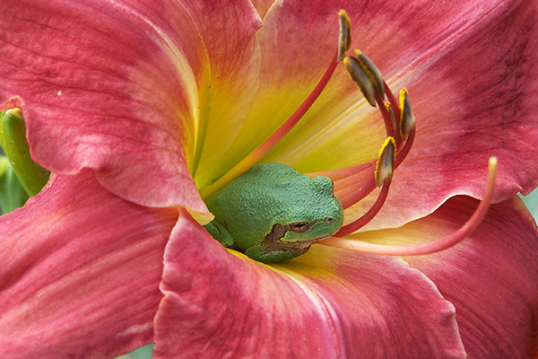 Amphibians are in peril globally, and Iowa’s native amphibians are no exception. Across our grounds various wetlands, ponds, and seasonal pools are havens and nurseries for our frogs, toads, salamanders, snakes, and turtles. Frogs can be found at the Waterside Garden, Palustrine Wetland, Dry Creek Bed, and the Adele & Dean Bowden Treehouse Village. Tadpoles abound in our standing water, and a chorus of frogs can be heard through the summer. Turtles occasionally cross our grounds to find new ponds, and have been spotted digging nests near the Orchard and Herb Garden. We are always careful to watch for all these little neighbors and garden decisions always keep these friends in mind. For instance, we only use slow release fertilizers in display beds to prevent fertilizer runoff from polluting water ways. Wet areas are left undisturbed during cold months to allow hibernating creatures to emerge successfully in spring. Finally, we build habitat and promote biodiversity in our natural spaces and gardens.